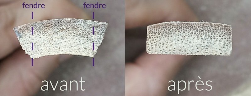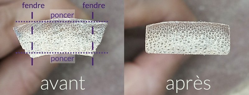La dernière étape consiste à ajuster les bords des lattes pour obtenir des angles à 90°. Le moyen le plus simple est de fendre à nouveau à l’aide de votre machette ou de votre couteau, puis de poncer avec du papier de verre (étape suivante).