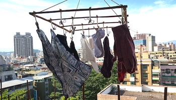 Il possède 16 pinces, mais on en met généralement beaucoup plus d’habits en fixant quelques vêtements directement sur les tiges de bambou.