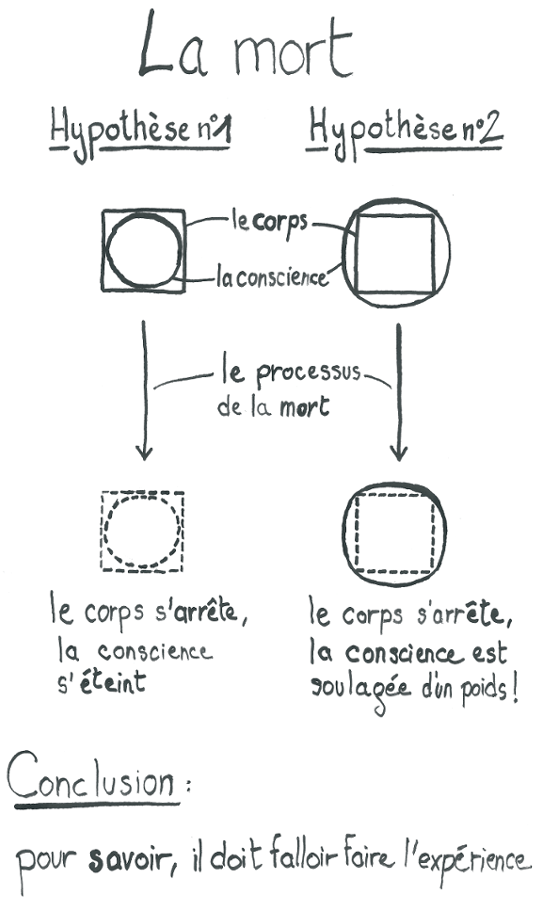 Résumons donc. Si je meurs, ma conscience subsiste. Je continue de percevoir des sensations, d’éprouver des émotions, de mener des raisonnements. Je peux rencontrer des gens et communiquer avec eux.