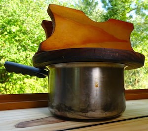 When this lid is put upside-down, a normal person could also see it as an old-style trivet, convenient when my bamboo trivet is not available.