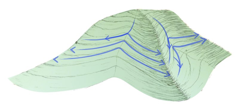 And the magic geometry happens when we draw on the landscape lines that are parallel to this keyline. Those lines, slightly sloping, are the ones that will always tend to lead water away from the talwegs, and towards the ridges. For this to happen, the valley needs to have this specific convex/concave shape, though.