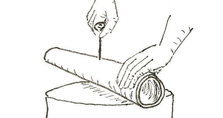 To drill safely, and precisely, you need to immobilize the bamboo between one hand and a wood support.