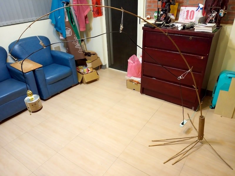 Here is a prototype of an arc-shaped — or fish rod-shaped! — bamboo light. I designed this lamp as a reading light for our previous house.