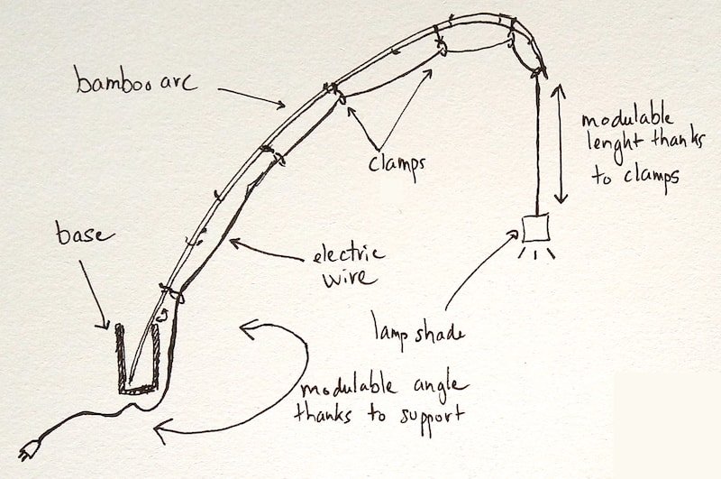 My original idea is an arc lamp whose arc would be stabilized by a bamboo base. This base would be either attached to the floor, or weight-loaded, or maintained by some sort of legs such as the bamboo sticks on the prototype hereafter.