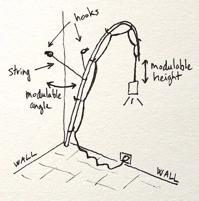 This version simplifies a lot the challenge of stabilizing the lamp but suppresses the possibility of moving the lamp from one side of the room to another.