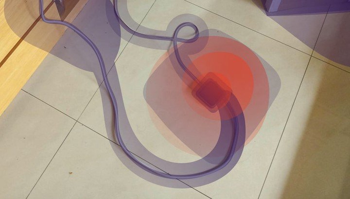 Sur la photo, le champ électrique est étroit quand le câble touche le sol, mais s’élargit quand il est en l’air. Il s’étend jusqu’à l’ordinateur, et même jusqu’au carton dessous, mais il s’arrête quand il atteint le sol, sous le carton.