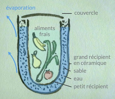 Le principe ? Grâce à l’évaporation de l’eau contenue entre deux récipients en céramique, l’intérieur du plus petit récipient est maintenu au frais.