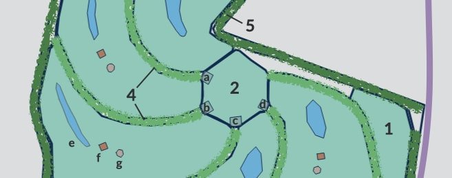 (3) Les 5 jardins-forêts sont indépendants les uns des autres, tous accessibles par le cœur de ferme. A terme, chaque jardin-forêt contiendra à une variété de plantes comestibles sur des buttes conduites suivant l’agroforesterie successionnelle situées entre les arbres endémiques (buttes et arbres non représentés sur le schéma), (e) au moins un bassin de rétention des eaux de pluie (autant que possible ombragé pour limiter l’évaporation et maintenir une masse fraiche en été), (f) une micro-habitation ou cabane de ~5 m2 pour une ou deux personnes (sans fondations, ossature bois, déplaçable), et (g) un abri de ~5 m2 pouvant servir d’étable pour un petit troupeau polyspécifique.